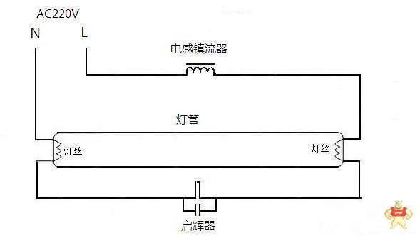 电感镇流器其实就是一个电感线圈,如下图,在通电的瞬间,交流电通过电感和灯丝向启辉器加压,使启辉器的内部气体产生弧光放电,并产生热量使得启辉器内部的金属弹片变形闭合,闭合之后弧光放电停止,此时由于温度冷却下来,使双金属片又回归原位,电路断开的瞬间,电感线圈因为突然断电,会产生很高的反电动势,此电动势和电源电压叠加施加在灯管两端,从而点亮灯管。
