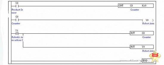 当光电传感器检测到产品,X0从关闭变成打开。C0作一次计数,当C0达到10,常开触点C0关闭,Y0=ON,机械手开始收拾产品。