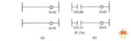 (3)线圈不能直接与左母线相连。由图2(a)不难看出编程者的意图是,使程序一运行10.00、10.01线圈即被驱动。要达到这样的目的,可以使用一个程序中未被调用的内部继电器(如200.00)的常闭触点或者特殊继电器253.15(常通继电器)的常开触点来驱动它们,既满足了编程者的功能要求,又不违背梯形图编程规则,如图2(b)所示。