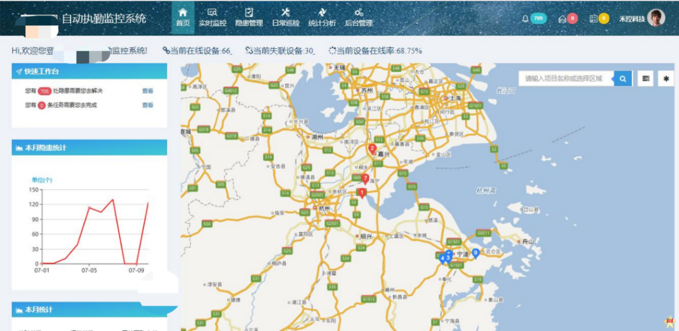 通过平台首页可以快速浏览隐患巡查界面或隐患处理界面、本月隐患、故障统计以及项目信息地图导航,智能调度技术人员可以在第一时间通过曲线、地图等各种方式查看隐患数量、隐患位置、隐患发生频率以及任务的接收、下发情况,并可以通过项目列表、地图快速查定位需要查询的项目情况。