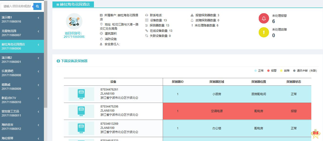 通过实时监控界面,除了可以实时显示项目所属客户、地址、建筑面积、消防设施、安全责任人、联系电话、设备数量、探测器数量等信息,还以更醒目的方式显示了未处理报警和未处理故障信息,下属设备和探测器,并可以查看各设备以及探测器基本信息、开关操作、数据监控、实时数据、参数设置、历史信息和报警信息等。
