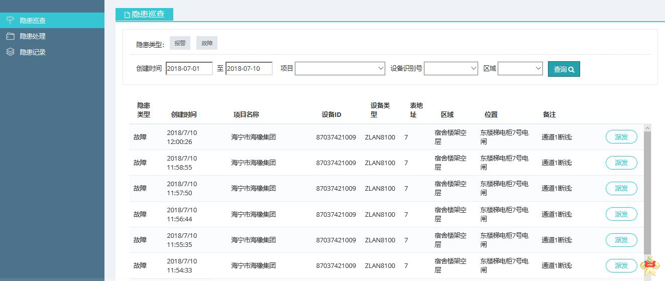 隐患管理包括隐患巡查、隐患处理、和隐患记录,隐患巡查的目的是为了隐患产生之后下发工单,所以页面中只显示未下发工单的隐患记录,包括隐患类型、创建时间、项目名称、设备ID、位置、故障原因等记录,并且可以通过“派发”按钮,派发工作任务;隐患处理即工单处理,表示工单需要当前登录用户确认,形成隐患处理的闭环,页面中只显示发给当前登录用户且未处理的工单记录;隐患记录显示所有的隐患记录,可以按照隐患类型(报警、故障)、状态(未派发、已派发未处理、已派发已处理)分类显示,支持按照创建时间、项目名称、所在区域等条件来对隐患记录信息进行针对性的查询操作。