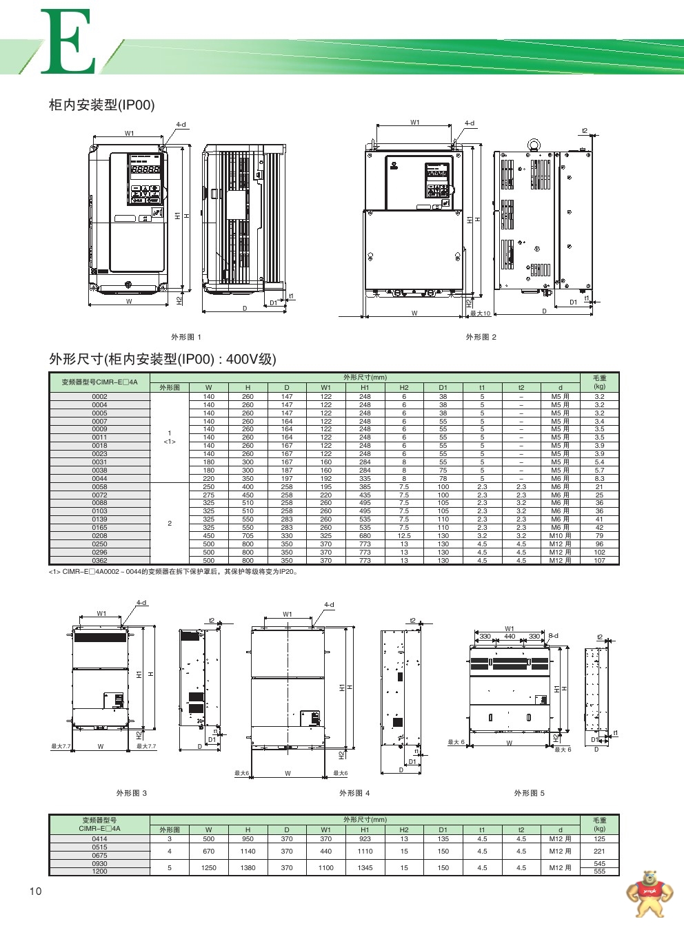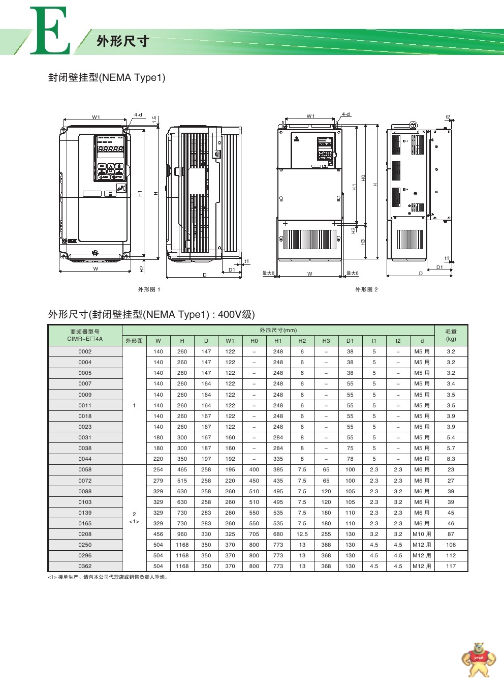 | 型号:CIMR-E 4W | 0103 | 0139 | 0165 | 0208 | 0250 | 0296 | 0362 | |