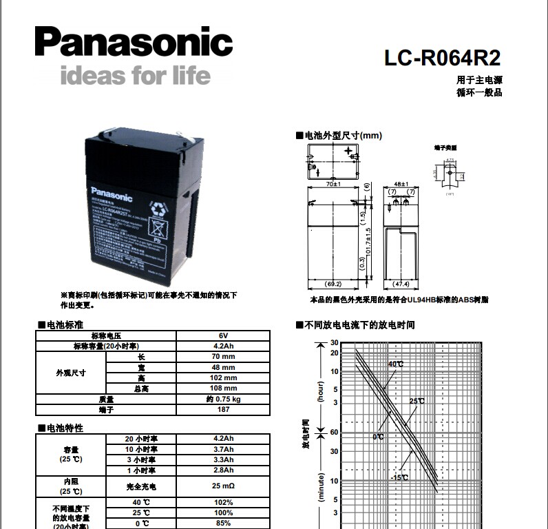 Panasonic铅酸蓄电池 松下LC-R064R2 6V4.2AH/6V4.5AH电池现货