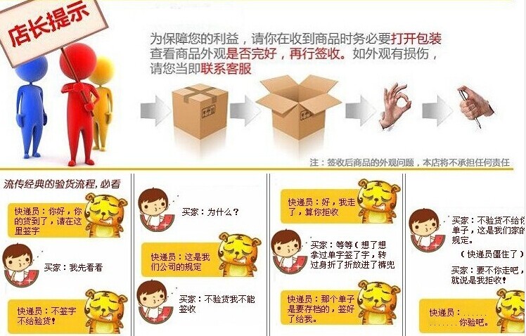 ·由于本公司销售产品均为易碎和易变形产品,为避免运输中出现产品破碎或变形等情况,快件签收前务必拆开验货,也可签收后和快递员一起拆开验货,此时如果发现产品有破损或缺少配件等情况可以当场拒收,让快递员退回发货方,同时尽快联系我们,这样操作可以避免因此带来的运费损失和产生纠纷的可能性.***降低了双方的损失,也保证了买卖双方的权益.另关于保修期内运费部分,收到货一周内出现问题来回运费我们全部负责,之后到保修期结束出现问题则买卖双方各负责一半,即运费双方现付.电池过度放电过度充电造成故障不在保修范围内,人为及客观原因造成故障亦不在保修范围内.
