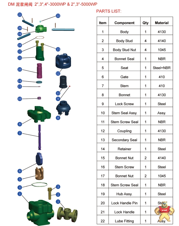 所有不同压力级别的螺纹端口连接的泥浆闸阀都符合API 6A螺纹尺寸。该阀杆为明杆设计,扭矩小,启闭容易。阀杆可得到永久润滑,阀杆和阀杆螺母通过支撑环实现高压和低压密封。