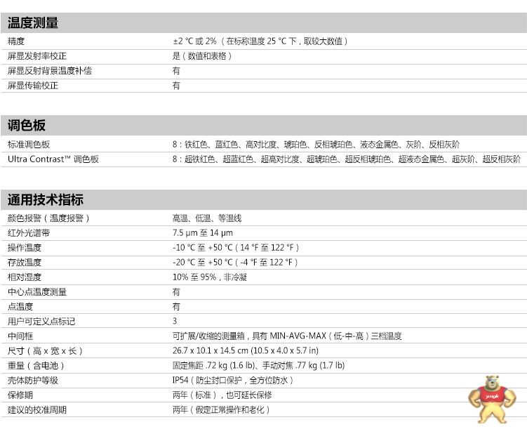 | 功能特点 | | • TiS65通过使用的手动对焦操作获得对焦清晰的高质量图像 • TiS60具有易于使用的定焦技术 • 图像质量 – 260x195 分辨率(50700 像素) • D:S(距离与光点尺寸比)为 417:1 • 温度测量范围 -20 °C 至 550 °C(–4 °F 至 1022 °F) • 通过专有的 IR-Fusion® 融合和 PIP 模式快速找出问题 – 捕捉所需细节以分析问题并清楚识别所在位置 • 3.5 英寸,320x240 LCD • 5 兆像素工业性能数字照相机 • 智能电池系统 – 带有 5 格 LED 电量水平显示的锂离子智能电池 • 通过电子邮件及 Fluke Connect® 实时共享图像 • 存储数千张图像 – 4 GB 内存和 4 GB 微型 SD 卡 | | |