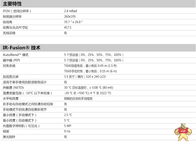 | Fluke Tis60/65 红外热像仪 | | | | 结合 260x195 分辨率、IR-Fusion® 技术和手动对焦功能,可提供高质量图像,从而更快速轻松地完成问题检测。 | |