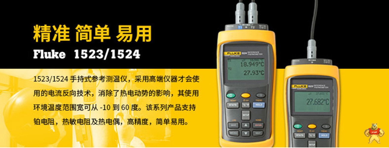 | Fluke 1523 1524手持式参考测温仪 | 1523/1524手持式参考测温仪支持铂电阻,热敏电阻及热电偶,高精度,简单易用。152X系列手持式参考测温仪,采用高端仪器才会使用的电流反向技术,消除了热电动势的影响,其使用环境温度范围宽可从-10到60度。除此之外,1523/1524集测量,绘图和数据记录于一身,是当今最便携易用准确最高的现场测温仪器,可选的悬挂选件,方便用户将1523/1524挂于测试现场自动测试及记录数 1523/24 采用了高端仪器中使用的电流反向技术,消除了热电动势的影响,可进行精密的温度测量。在环境温度 -10 ºC 到 60 ºC 之间均可保证其技术指标。专用的精密电阻器和高度稳定的参考电压源使得 1523/24 的精确度几乎不受环境温度影响。 1523 参考测温仪是通用的单通道测温仪,集测量、绘图和记录三种功能于一身。支持 PRT/RTD、热电偶和热敏电阻,可以根据工作需要灵活选择合适的探头。1524 参考测温仪可让您事半功倍。两个通道、三种传感器和高速的测量可帮助您提高工作效率,它具备 1523 的所有功能,而且还可以记录温度。 | |