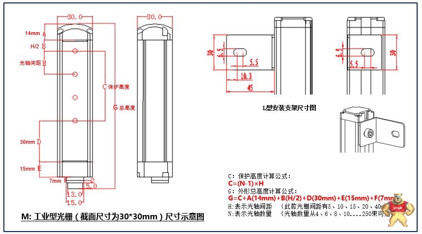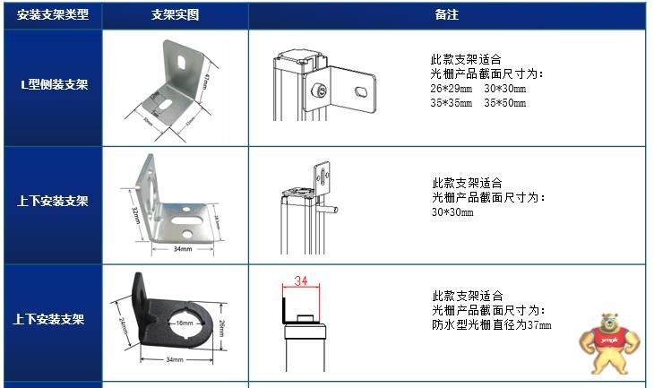 希默SIMER安全光栅产品特点: 安装支架说明: 产品应用: 产品尺寸说明: 安全光栅选型说明: