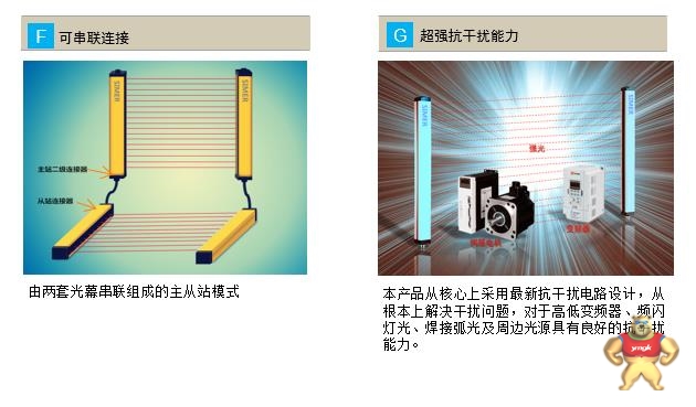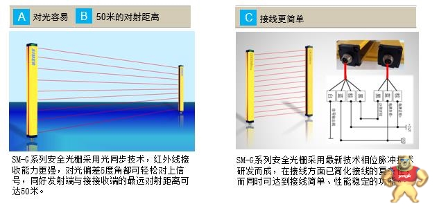 M-G系列安全光栅采用光同步技术,红外线接收能力更强,对光偏差5度角都可轻松对上信号,同好发射端与接接收端的最远对射距离可达50米。SM-G系列安全光栅采用最新技术相位脉冲技术研发而成,在接线方面已简化接线的复杂性,而同时可达到接线简单、性能稳定的功能。