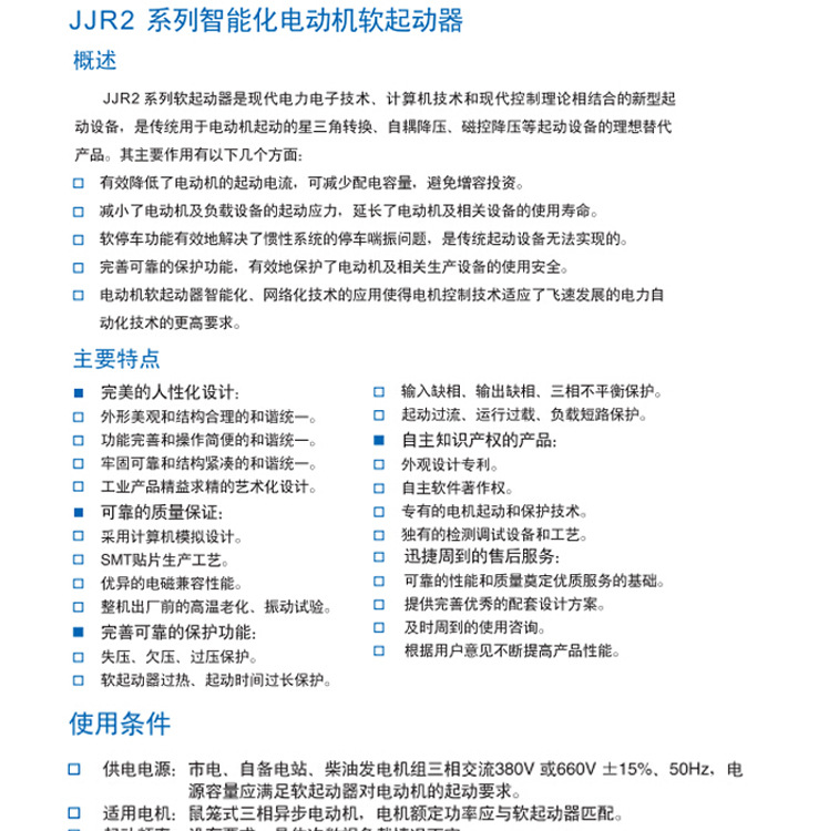 JJR2系列软起动器是现代电力电子技术、计算机技术和现代控制理论相结合的新型起动设备,是传统用于电动机起动的星三角转换、自藕降压、磁控降压等起动设备的理想替代产品